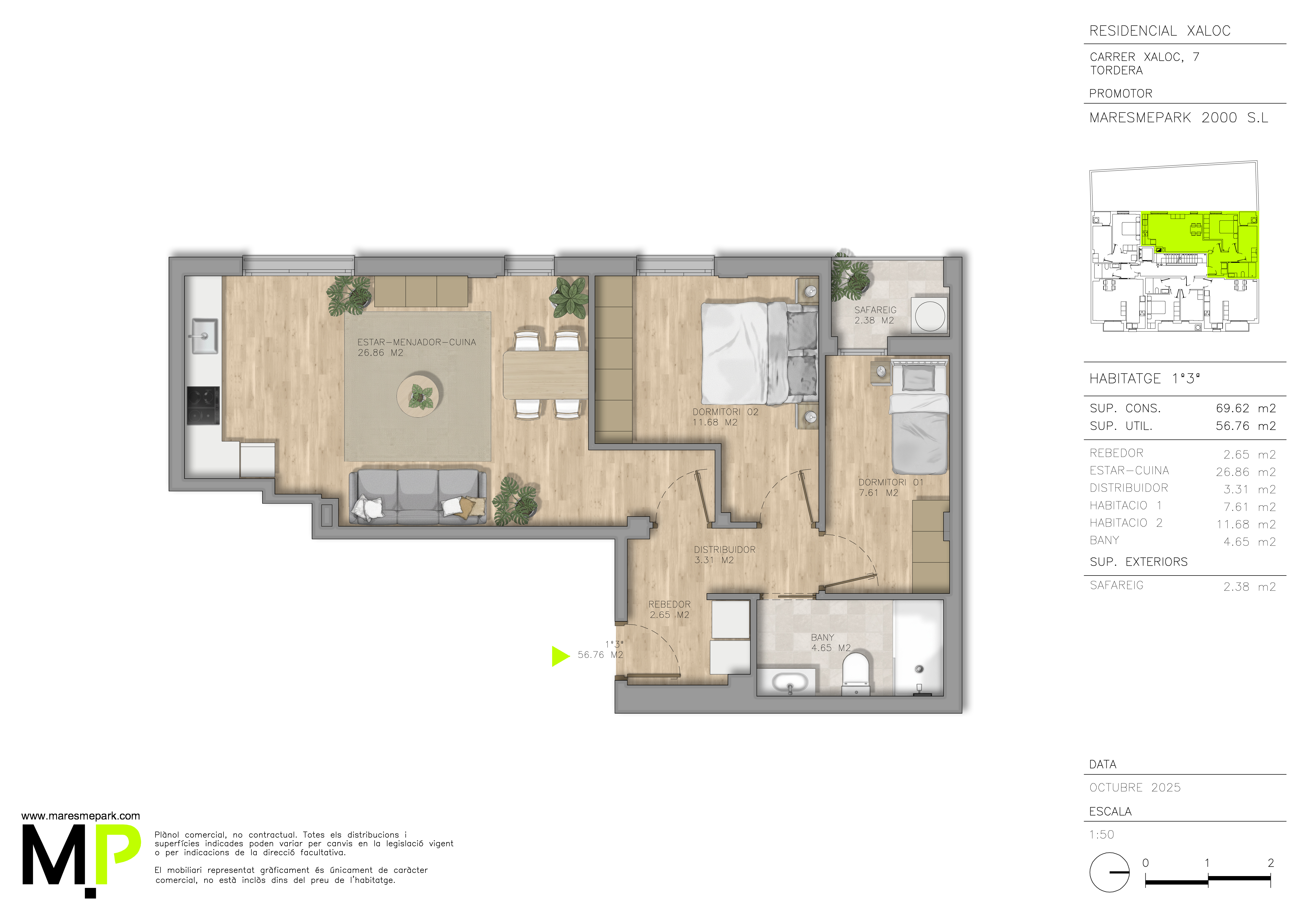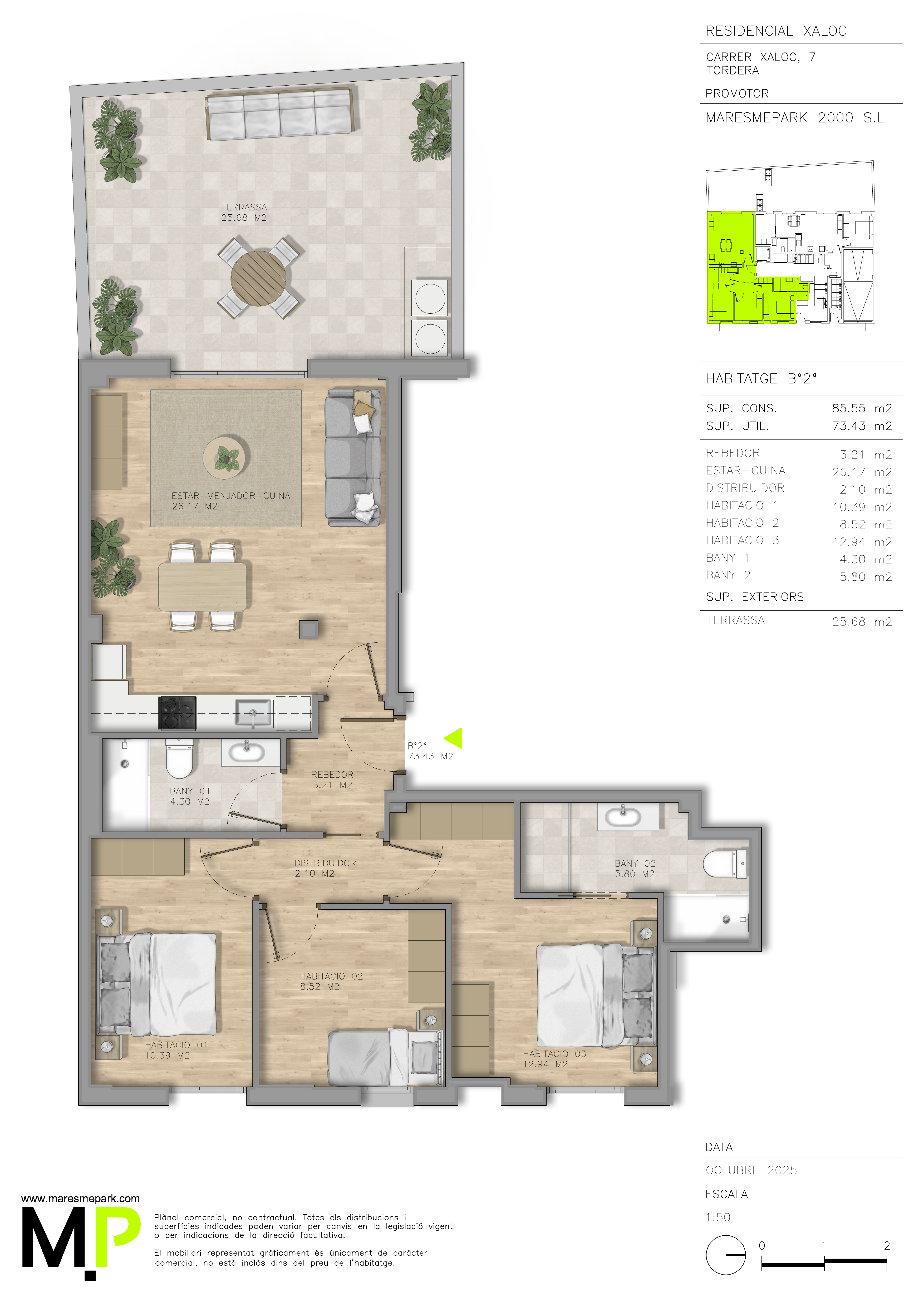 Aires de Xaloc se sitúa estratégicamente en la tranquila calle Xaloc de Tordera. Esta promoción forma parte de un singular proyecto residencial dual, colindando en su parte posterior con nuestra promoción "HC Living", lo que consolida una manzana moderna y renovada, manteniendo la independencia y privacidad de sus solo 7 vecinos.