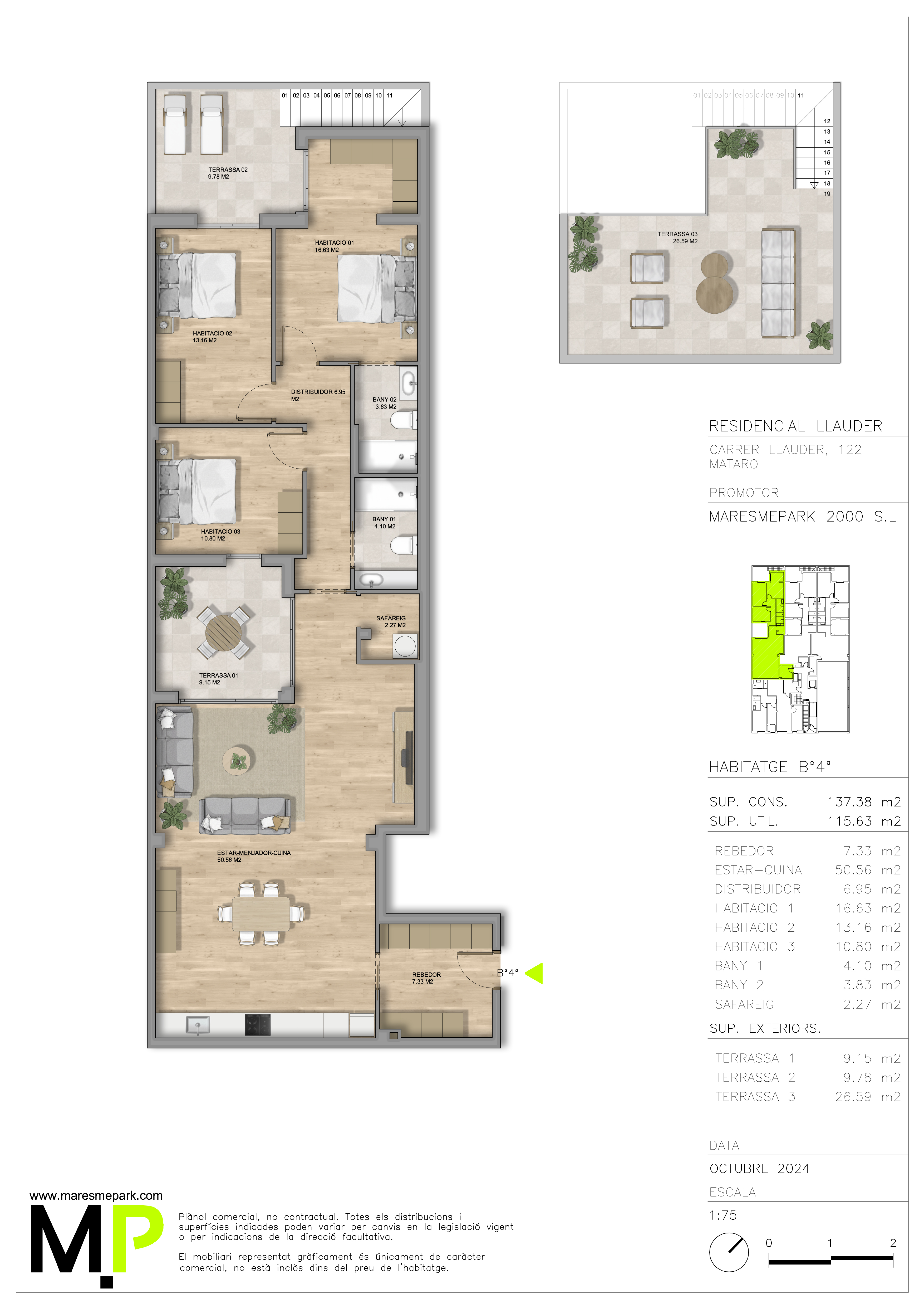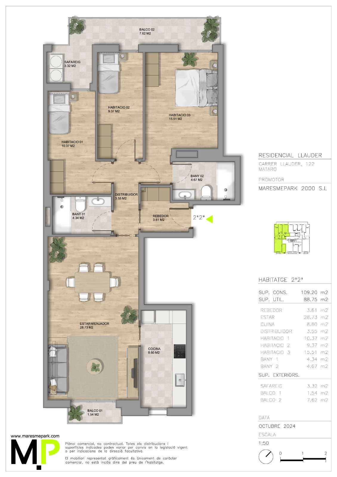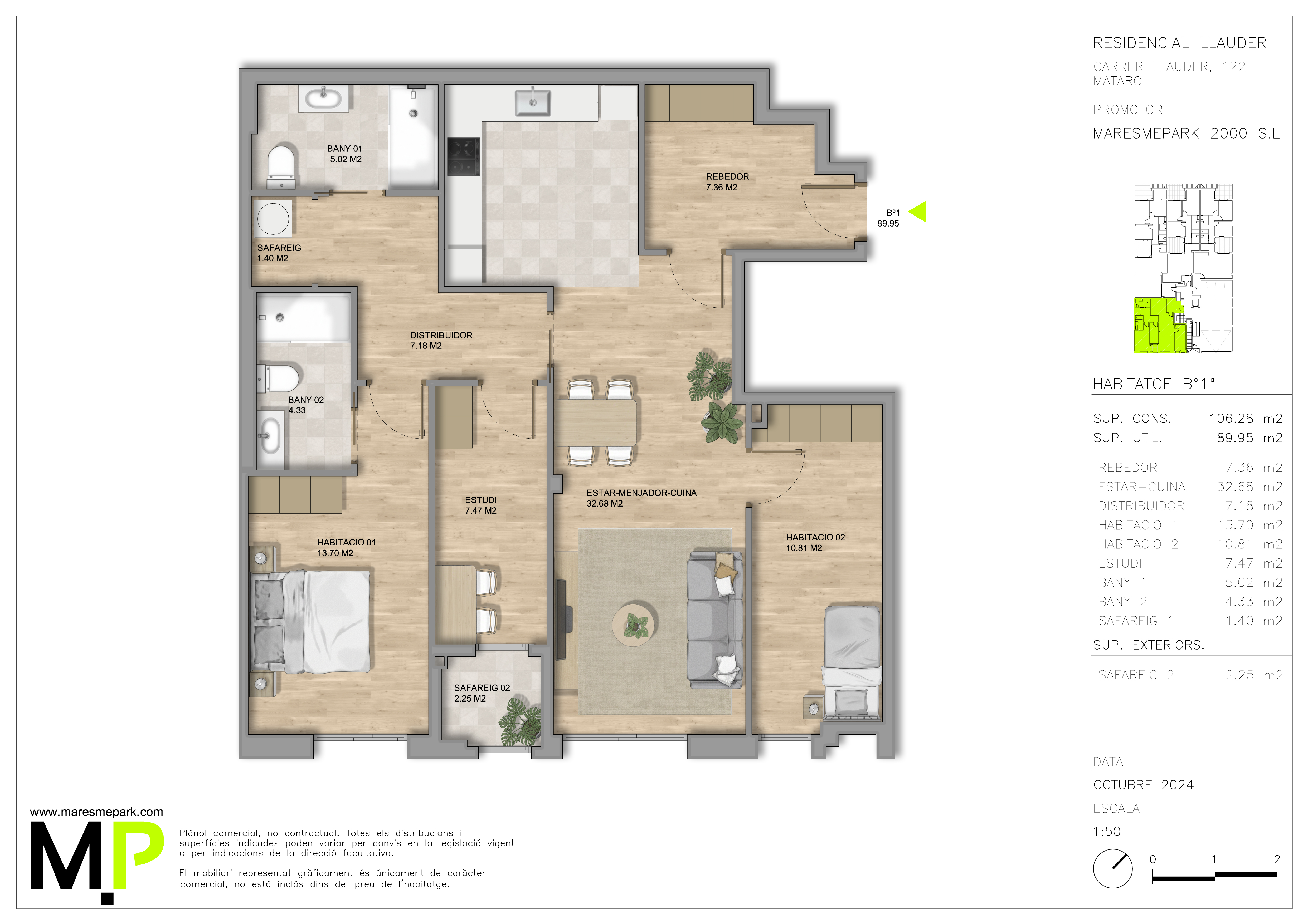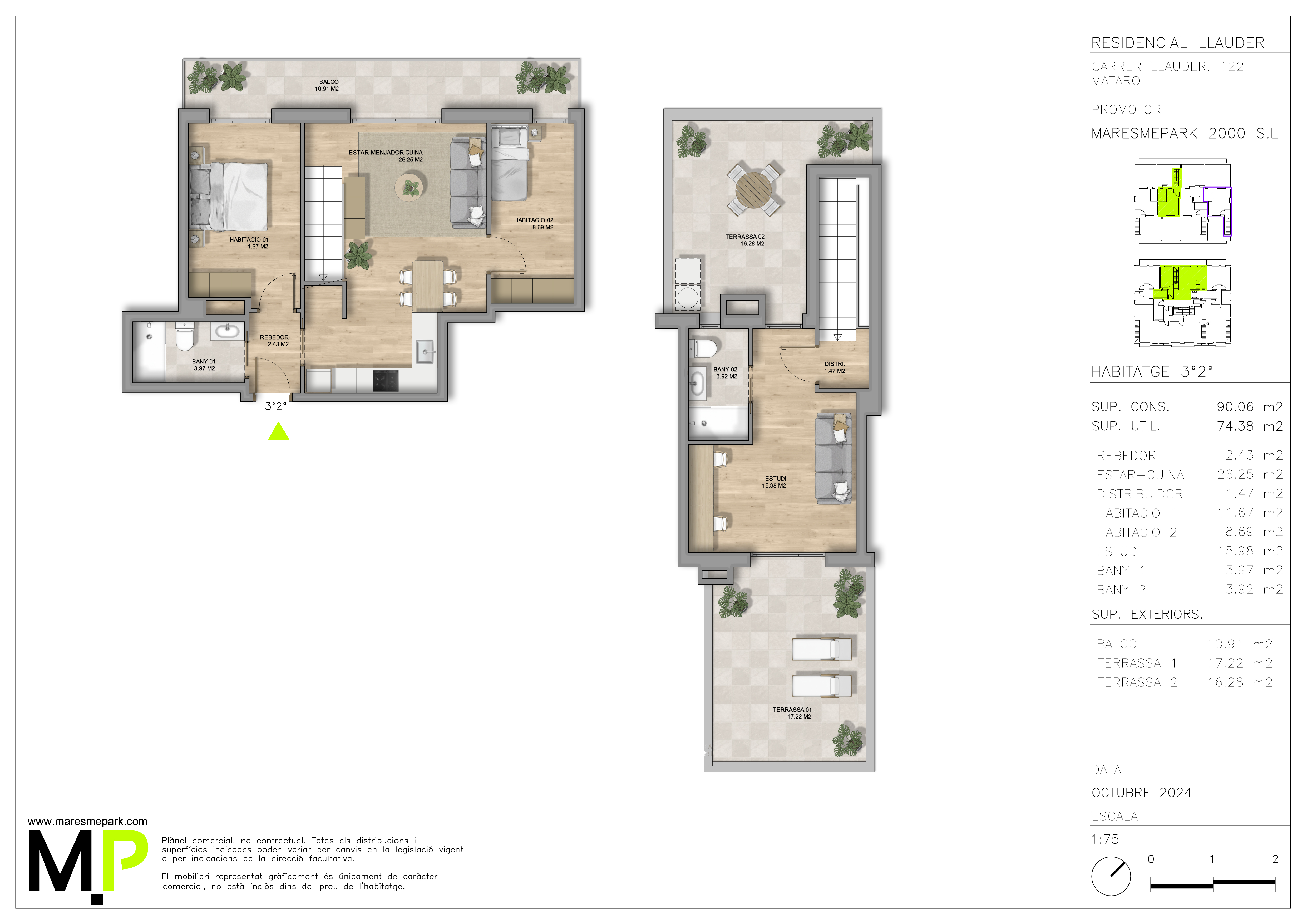 LLAUDER RESIDENCIAL es una promoción de 14 viviendas de 1, 2, 3 y hasta 4 dormitorios ubicada en la calle Llauder 122–126 de Mataró. Todas las viviendas destacan por su diseño moderno y funcional, con amplios patios y terrazas que aportan luz natural y confort a cada estancia.